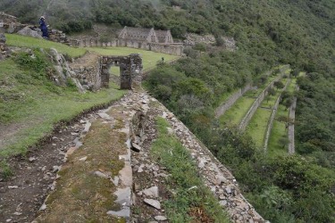 Otra de las estructuras impresionantes de Choquequirao es una enorme escalera que al amanecer del solsticio de verano es iluminada completamente por los rayos del sol. Si bien todas las edificaciones son de piedra, algunas de ellas estuvieron cubiertas de arcilla tanto al interior como por fuera, por lo que exhiben un color anaranjado claro.