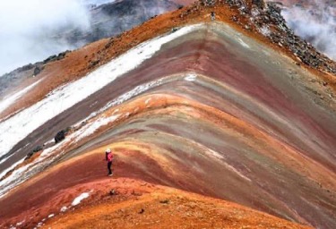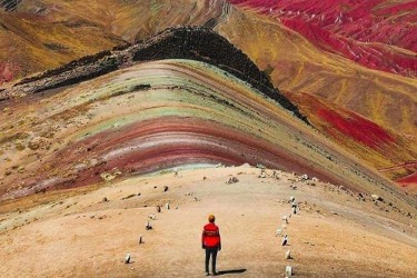 El cuarto y último día se parte muy temprano hacia el destino de la montaña arcoíris o Vinicunca, ubicada en el distrito de Pitumarca y su cumbre alcanza los 5,200 metros sobre el nivel del mar. La variada gama de colores que cubre la superficie del Vinicunca se debe, según la Sociedad Geológica del Perú, a una compleja historia geológica de sedimentos marinos, lacustres y fluviales. Estos sedimentos, transportados por el agua que antes cubría la zona, datan de los periodos terciario y cuaternario, es decir, de hace 65 a dos millones de años.